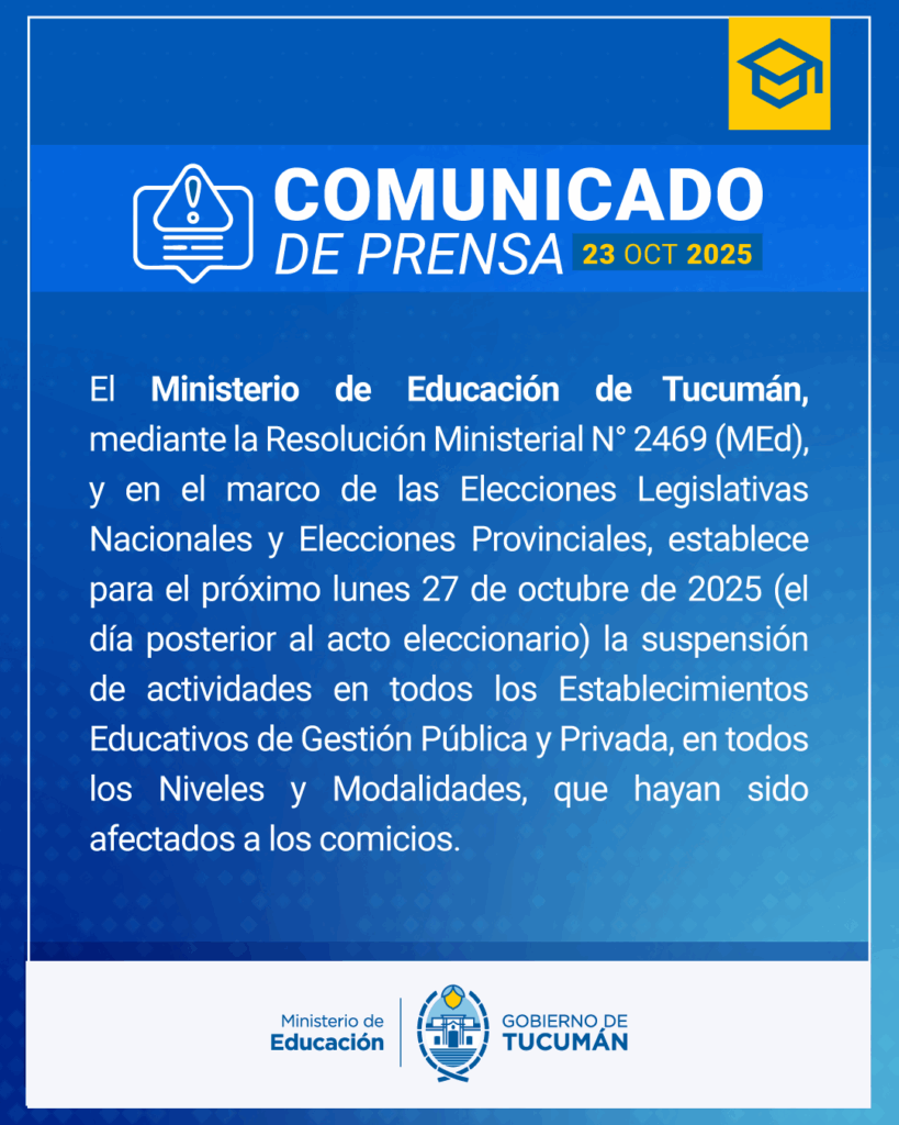 El Ministerio de Educación de Tucumán, mediante la Resolución Ministerial No 2469 (MEd), y en el marco de las Elecciones Legislativas Nacionales en todo el territorio y las Elecciones Provinciales (exclusivamente en el municipio de Juan Bautista Alberdi), establece para el próximo lunes 27 de octubre de 2025 (el día posterior al acto eleccionario) la suspensión de actividades en todos los Establecimientos Educativos de Gestión Pública y Privada, en todos los Niveles y Modalidades, que hayan sido afectados por los comicios.