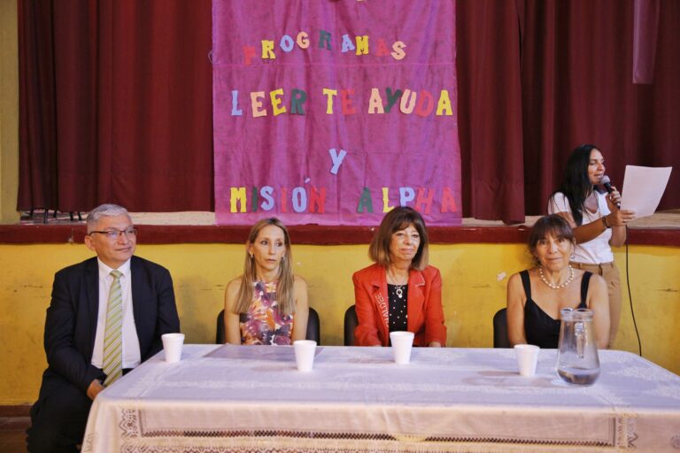 Las autoridades que encabezaron la jornada fueron la ministra de Educación, Susana Montaldo; la secretaria de Estado de Educación, Gabriela Gallardo; el director de Educación Primaria, Carlos Díaz; la directora Ejecutiva y Fundadora de Fundación Leer, Patricia Mejalelaty; la doctora en Lingüística de la Fundación Leer, Agustina Miranda; el referente del Plan Jurisdiccional de Alfabetización, Franco Grignola, y la directora de la escuela anfitriona, Mariela Perdigón Peralta.