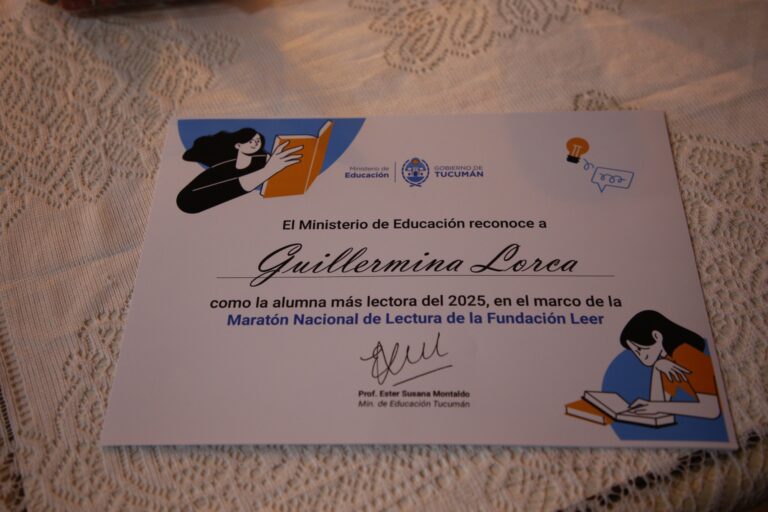 La protagonista de la jornada fue Guillermina Lorca, distinguida por ser “la más lectora” de Tucumán. La alumna, emocionada, explicó: “En la página de la maratón había muchos libros y me gustaba leerlos. Me gusta leer porque me recuerda mucho a mi abuelo. Me emocioné mucho con este premio porque no lo esperaba”.